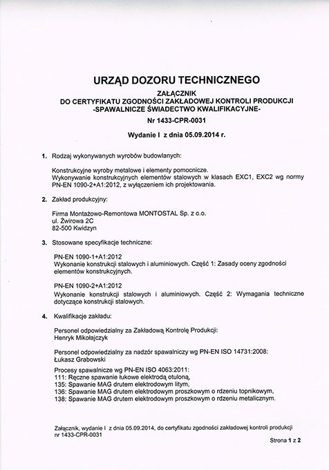 Certyfikat na konstrukcyjne wyroby metalowe i elementy pomocnicze, konstrukcyjne elementy stalowe w klasie EXC1, EXC2