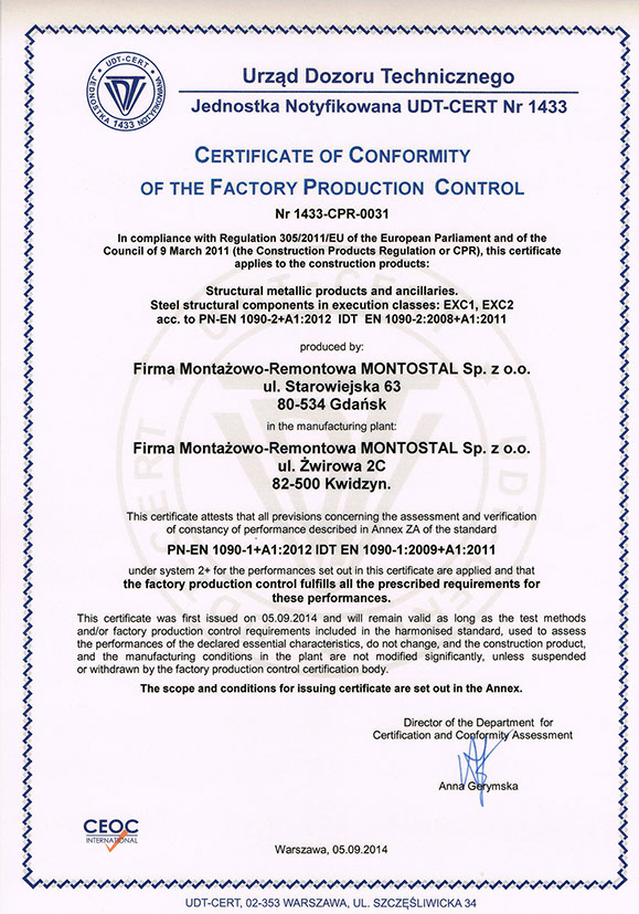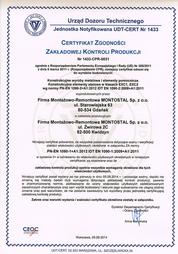 Certyfikat na konstrukcyjne wyroby metalowe i elementy pomocnicze, konstrukcyjne elementy stalowe w klasie EXC1, EXC2